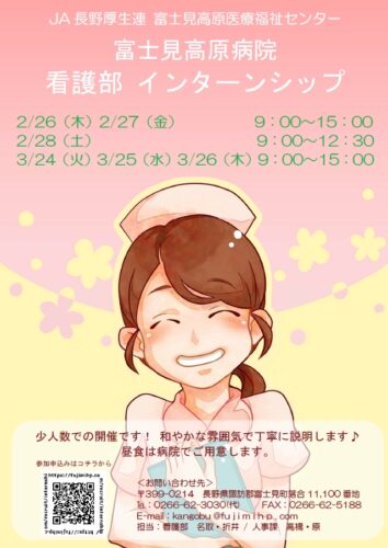 富士見高原病院では、「看護部インターンシップ」を開催いたします。土曜日での開催も予定しております。 少人数の開催で、和やかな雰囲気で丁寧にご説明いたします。また、昼食をご用意いたしますので、担当者と楽しくお召し上がりいただきたいと存じます。